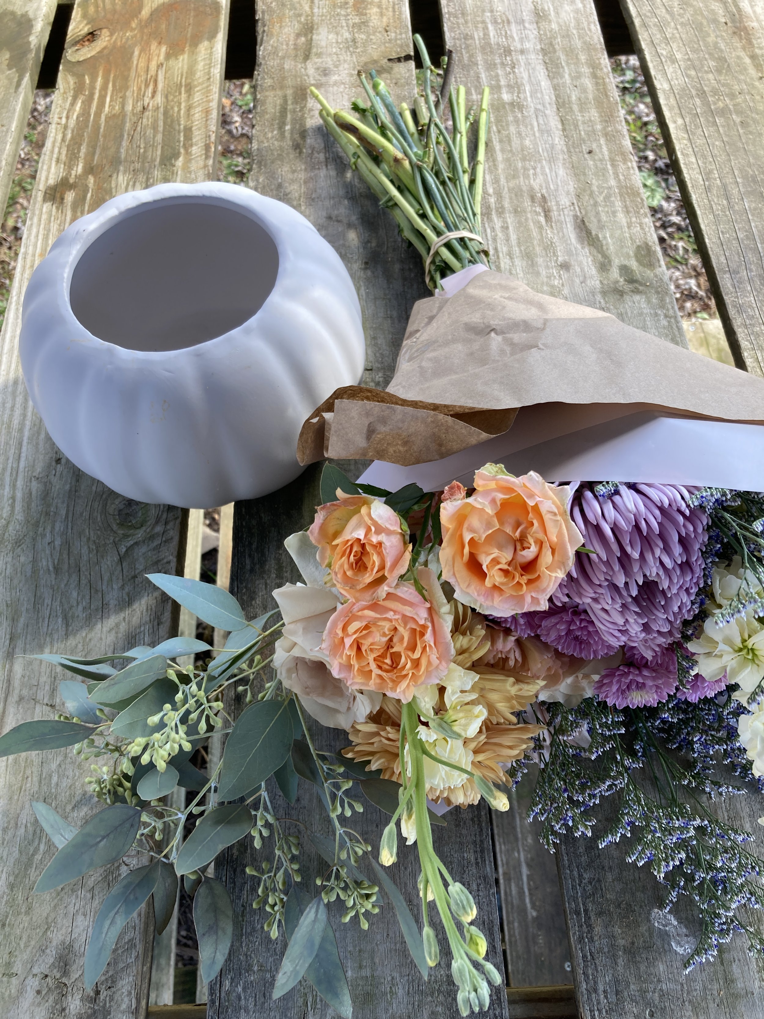 Local delivery available for artfully crafted arrangements and our new Pumpkin Bouquet Kit.